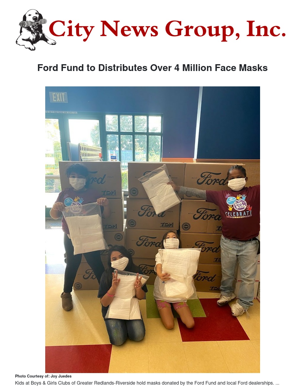 Ford Motor Company Fund teamed up with local nonprofits and Ford dealerships throughout the state to distribute over 4 million medical-grade face masks across California, including at Boys & Girls Clubs of Greater Redlands-Riverside.