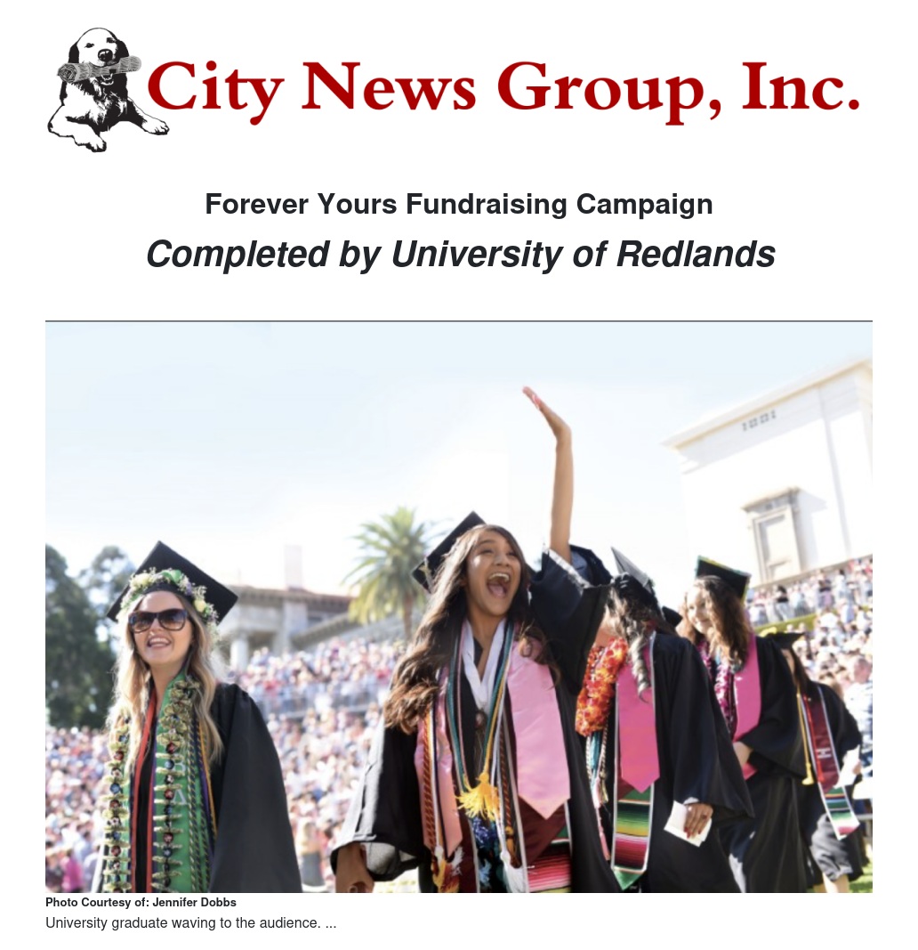 With $207.2 million in gifts and pledges from 15,573 donors, the University of Redlands has successfully completed the Forever Yours comprehensive fundraising campaign, the largest and most ambitious in its 115-year history. “While the results of Forever Yours are impressive, the real power of this campaign is that it brought people together and reminded them of their love for this great University,” says President Krista L. Newkirk. “Their generosity set an example for the next generation, and they have left a tremendous legacy for our University today, tomorrow, and forever.”