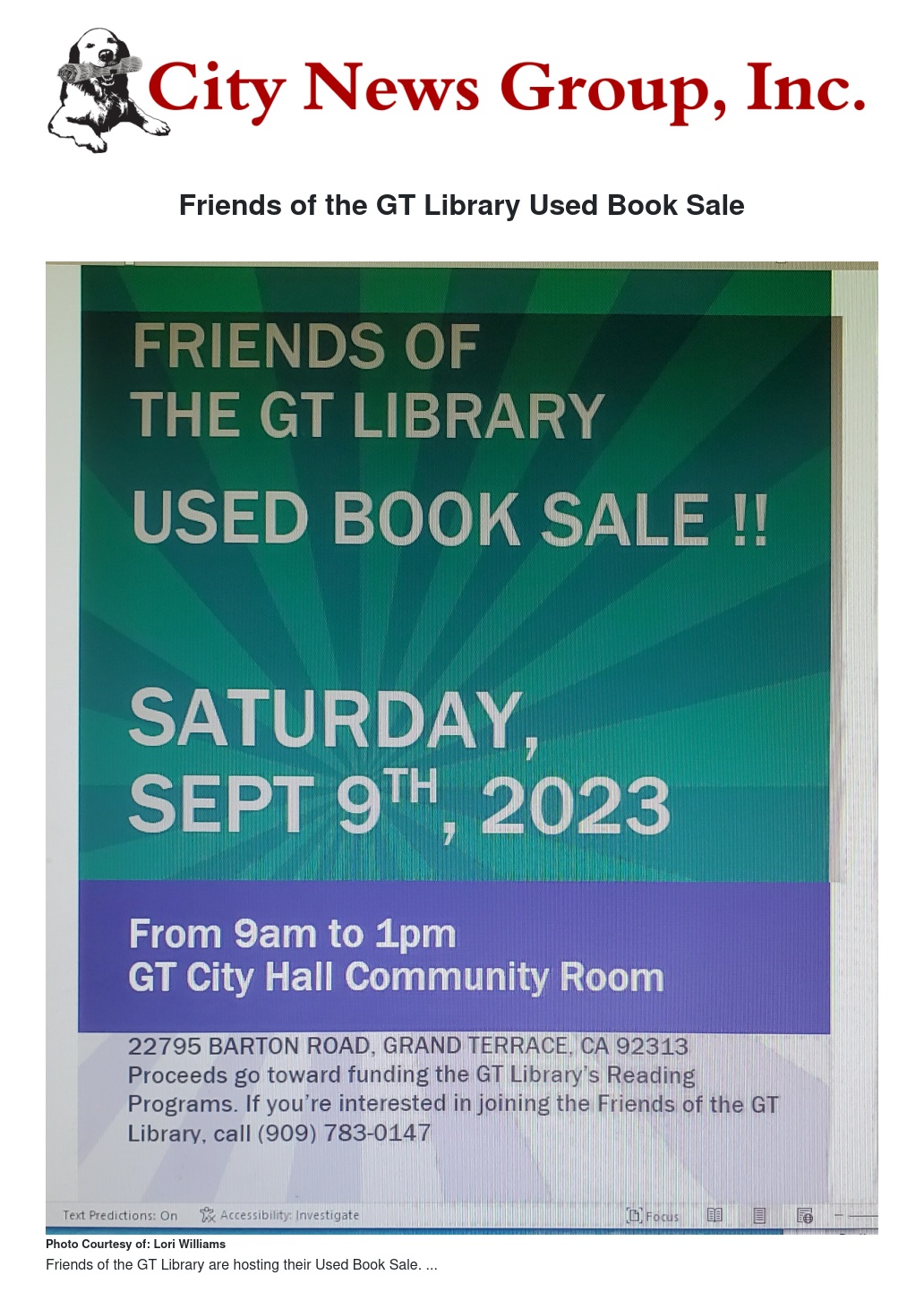 The Friends of the Grand Terrace Library's next Used Book Sale is Saturday, September 9th at Grand Terrace City Hall – Community Room, 22795 Barton Road, Grand Terrace, from 9 AM to 1 PM.