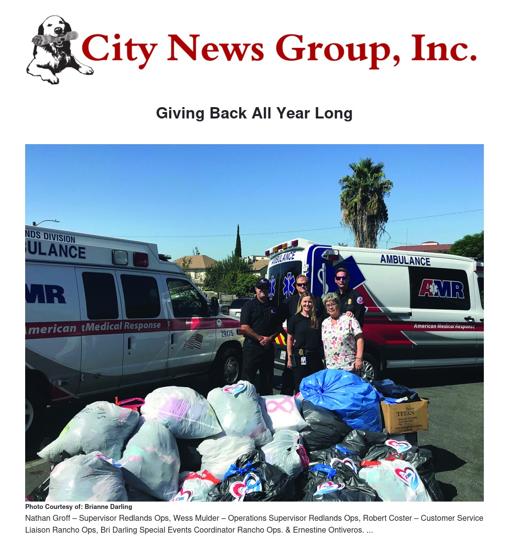 Our newest initiative to help people in our community is our Clothing Drive. The Rancho Care Team and the Trauma Hawk Care Team at the Rancho and Redlands offices are asking for the employees on-going support by donating gently used or new clothing and toiletry items to our offices. All items collected will go to shelters and centers in San Bernardino County throughout the year. It is important for AMR to give back to our community and care for others, it is the core of who we are as a company and we will continue doing what we can in the future to make a difference.