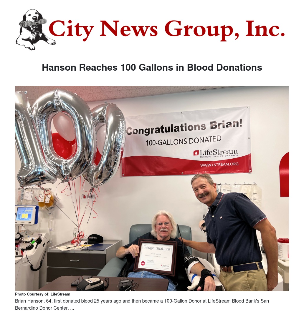 On Wednesday, Aug. 17, Hanson reached his lifetime blood donation milestone, becoming a 100-Gallon Donor at LifeStream Blood Bank's San Bernardino Donor Center, 420 E. Hospitality Lane.