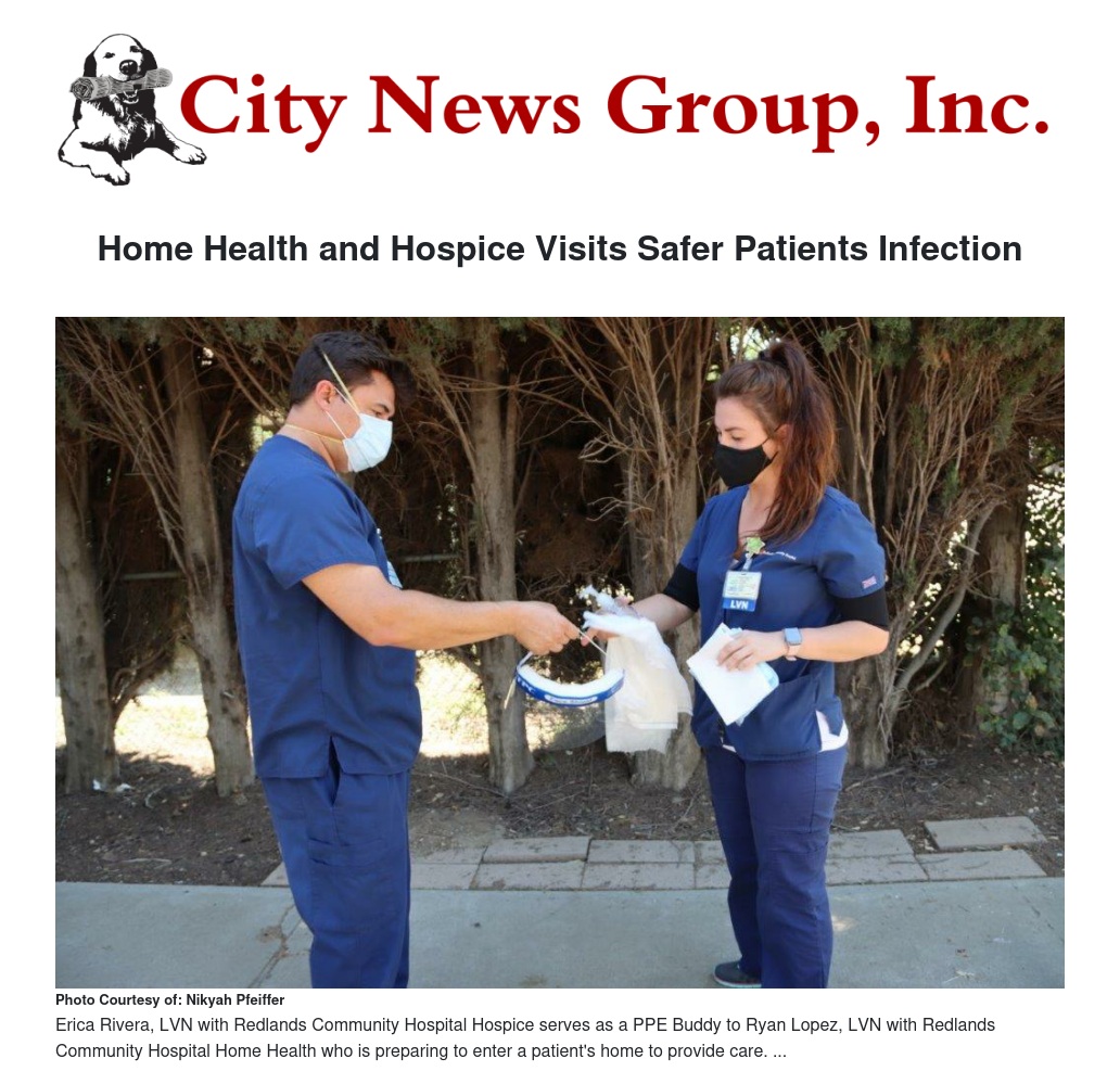 Immediately after the COVID-19 pandemic was declared, Redlands Community Hospital (RCH) started its “PPE Buddies” program for its Home Health and Hospice services. “PPE Buddies” are hospital employees who help Home Health and Hospice clinicians safely wear and remove personal protective equipment for infection control before and after entering a patient’s home.