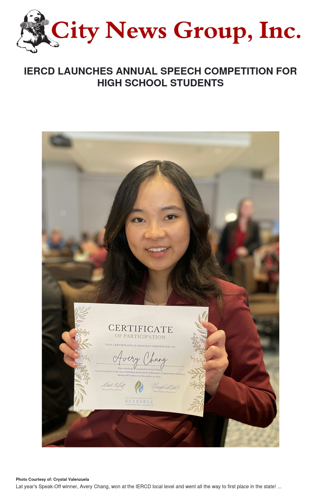 IERCD LAUNCHES ANNUAL SPEECH COMPETITION FOR HIGH SCHOOL STUDENTS by Crystal Valenzuela - City News Group, Inc.
