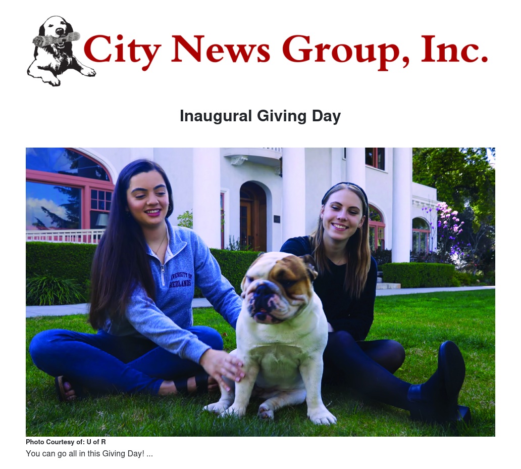 Mark your calendars! On April 4, the University of Redlands will launch its inaugural “University of Redlands Giving Day,” a crowd-driven fundraising event to rally support for programs, outreach, and sports at the University. Over the span of 24 hours, anyone can visit givingday.redlands.edu and donate to a program or campus organization of their choice.