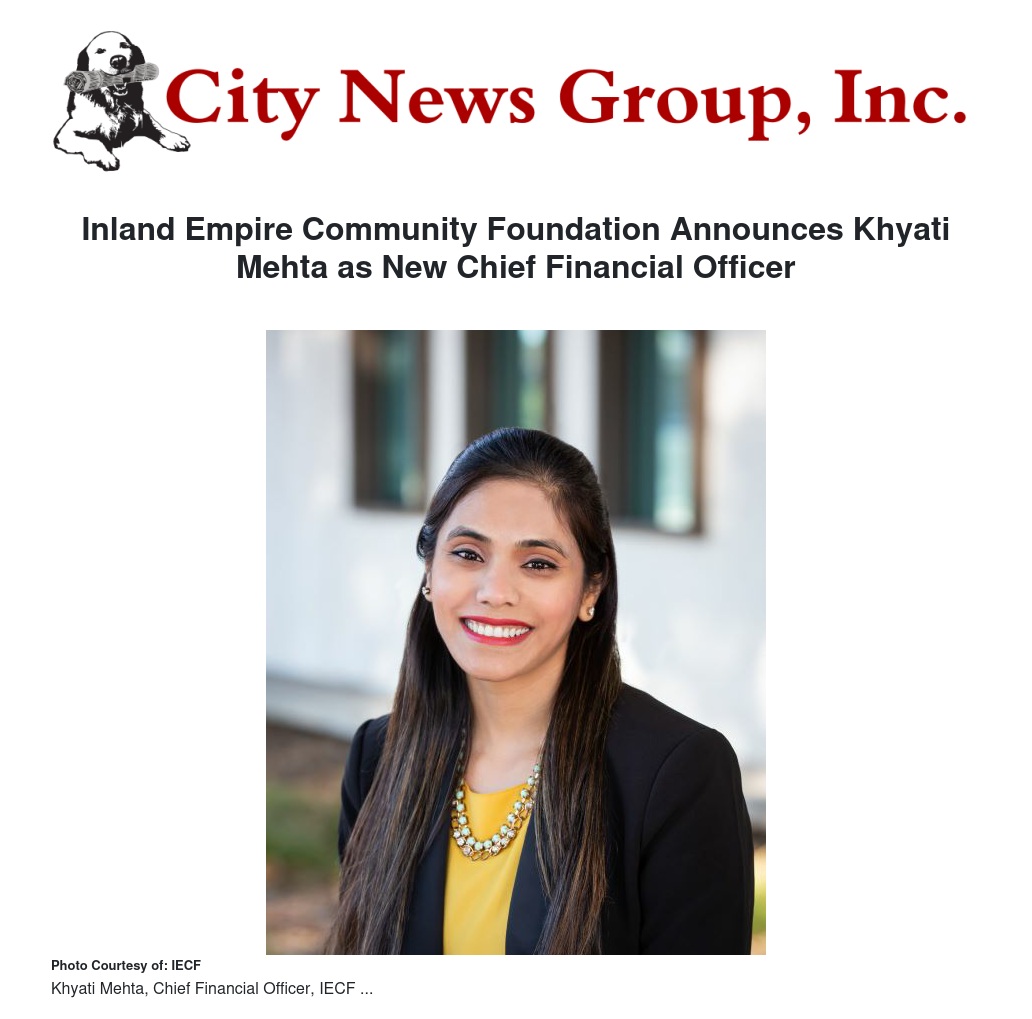 "We are excited to welcome Khyati to our team," said Decker. "Her background in finance, combined with her dedication to serving communities, will be invaluable as we continue to support our donors’ passions and advance our leadership initiatives in the Inland Empire. Khyati's leadership will ensure that IECF remains financially strong and well-positioned to achieve our vision for the future of the region.”