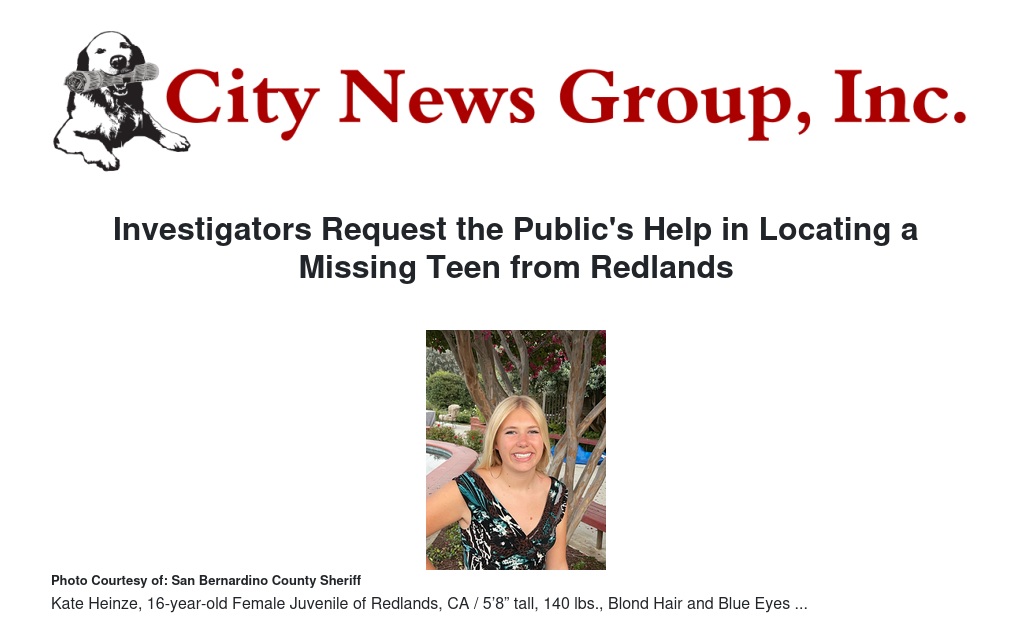 MISSING PERSON: Kate Heinze, 16-year-old Female Juvenile of Redlands, CA / 5’8” tall, 140 lbs., Blond Hair and Blue Eyes