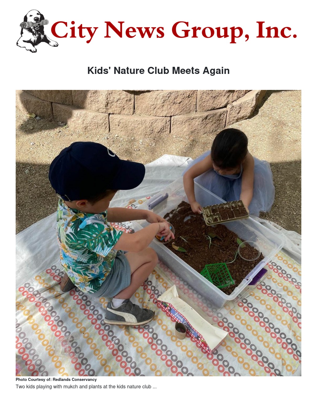 Redlands Conservancy's Kids' Nature Club brings small children, ages 3 to 7, into the natural world where they discover and experience science found in nature, alongside their caregiver and the class guide. Teacher Leslie Scofield leads the next gathering on Saturday, November 15 at Gateway Ranch, Redlands Conservancy's Outdoor Experience Headquarters at 31313 Live Oak Canyon Road. This program will take kids and their caregivers on a Scat and Tracks hike on the Saha'tapa Loop Trail at Gateway Ranch. They will be hiking between 1 and 2 miles while moving at a toddler's pace, with frequent stops for discovery. Participants should be prepared for hands-on learning and getting dirty. The program is free and open to the public, and starts at 9:30 at the ranch. Please register at: