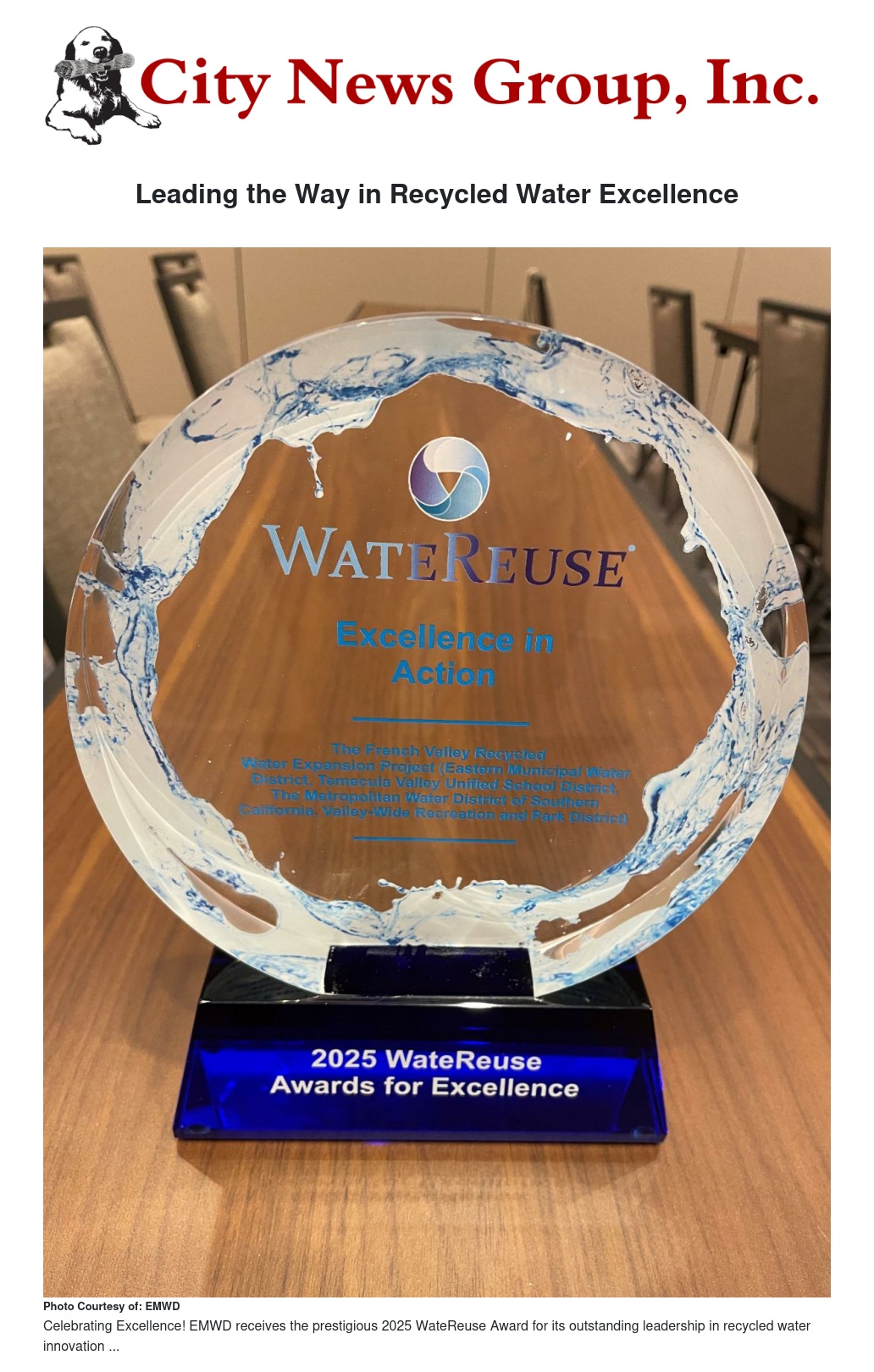 The Award for Excellence is presented annually to agencies that develop forward-thinking projects and programs to advance recycled water use, policy, education, and innovation. EMWD is the first agency to earn the honor for four consecutive years.