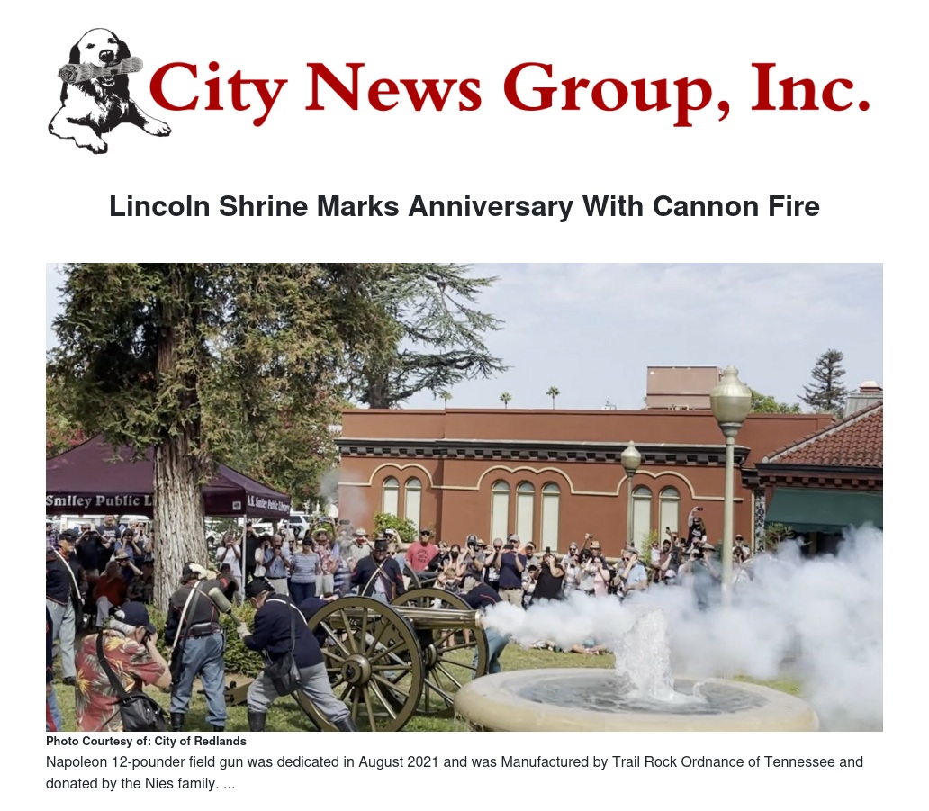 Celebrate the one-year anniversary of the dedication of the Lincoln Memorial Shrine’s cannon at 10 a.m. Saturday, Aug. 20, in Smiley Park, between the Lincoln Shrine and A.K. Smiley Public Library.