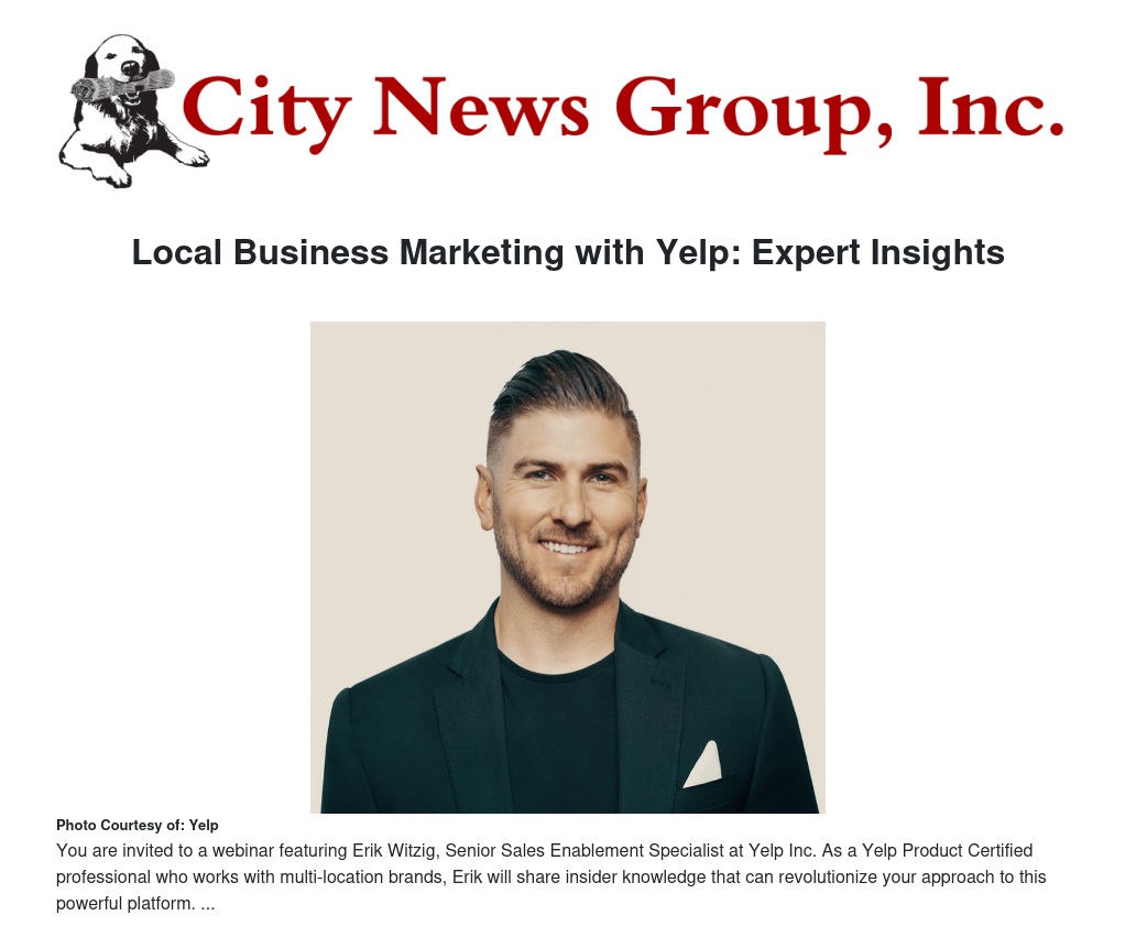 You are invited to a webinar featuring Erik Witzig, Senior Sales Enablement Specialist at Yelp Inc. As a Yelp Product Certified professional who works with multi-location brands, Erik will share insider knowledge that can revolutionize your approach to this powerful platform.