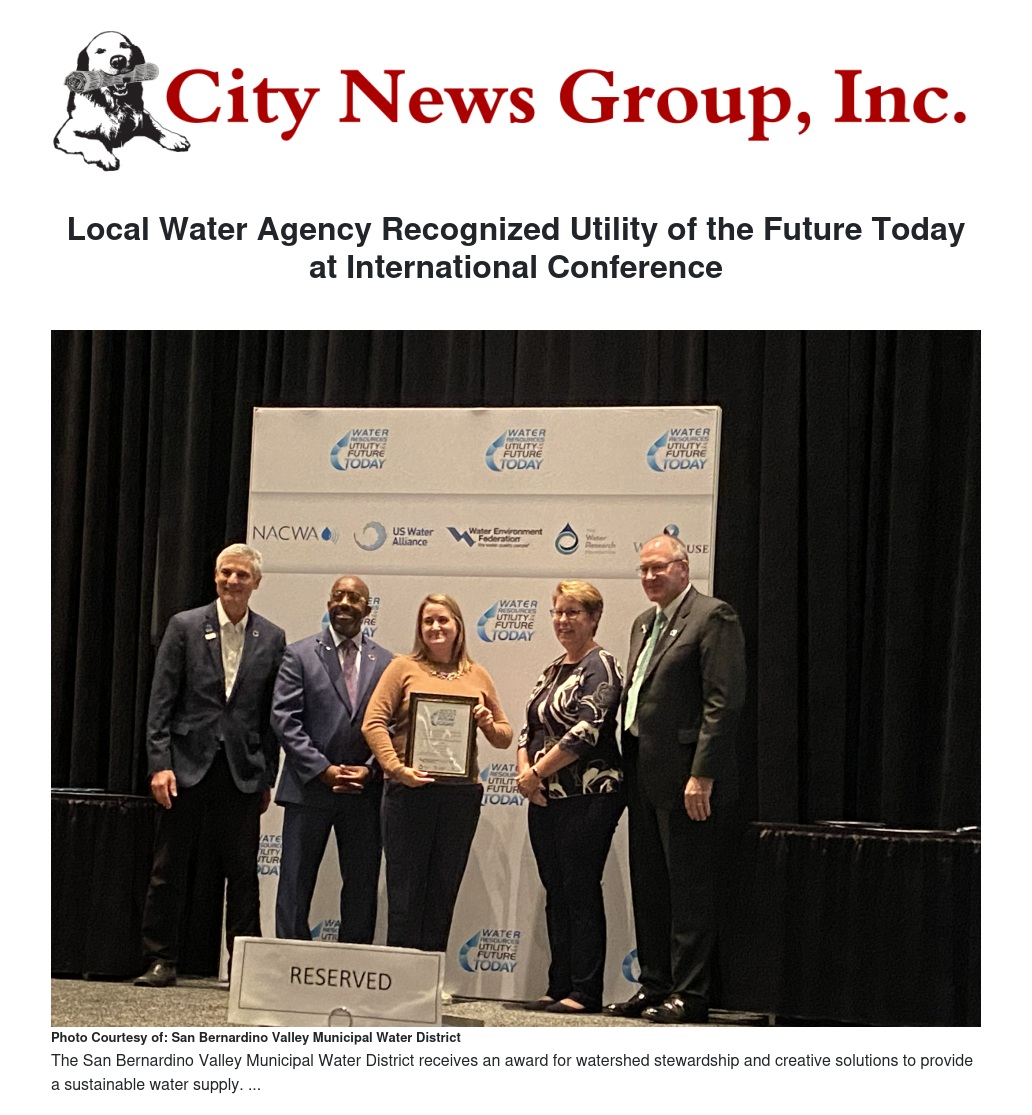 The San Bernardino Valley Municipal Water District was among 34 water resource recovery facilities recognized as a Utility of the Future Today recipient during the international Water Environment Federation’s Technical Exhibition and Conference (WEFTEC) in New Orleans on October 11, 2022. As the nation’s water systems transform operations through innovation and technology, the Utility of the Future Today is an opportunity for the efforts of water agencies around the world to be recognized.