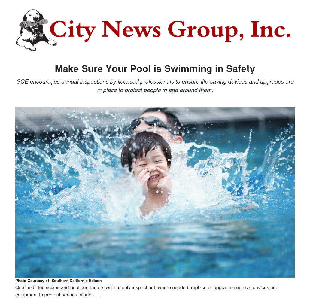 “Since swimming pools, hot tubs, and spas bring water and electricity close together, these inspections are critically important,” said Ted Gribble, senior manager of Enterprise Risk Management & Public Safety at Southern California Edison. “It is also paramount, though, for everyone’s safety, that pool owners or unlicensed cleaning crews never do these inspections.”
