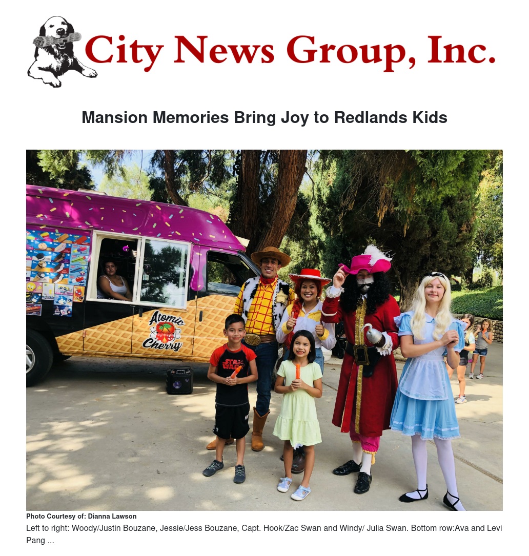 Last Summer, Mansion Memories started holding Pop Up Popsicle Parties (PUPPs). It was so successful they brought them back for the Summer of 2021! They bring the Atomic Cherry ice cream truck to their nominating agencies it partners, like the Redlands YMCA, Thrive Single Moms group and Redlands Boys & Girls Club. Volunteers dressed up as classic storybook characters also came along, safely interacting with the children while they enjoyed their popsicles.