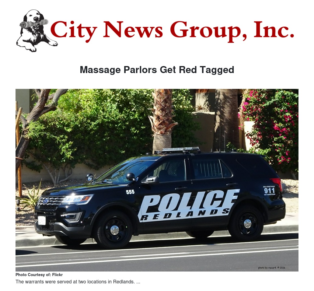 On Thursday, December 5, 2019, investigators from the San Bernardino County Human Trafficking Task Force, along with officers from the Redlands Police Department and Redlands Code Enforcement, served two search warrants related to ongoing prostitution at two massage parlors in the City of Redlands. Over the past several months, complaints regarding prostitution occurring at the massage parlors were received by the Redlands Police Department. Redlands Police officers brought the concerns to the attention of the Human Trafficking Task Force and requested assistance in addressing the complaints. Investigators conducted surveillance and undercover operations and discovered evidence of ongoing prostitution and possible human trafficking occurring at both locations.