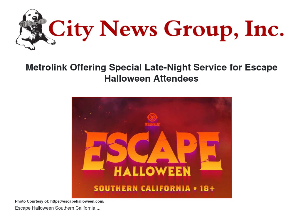 Metrolink Offering Special Late-Night Service for Escape Halloween Attendees by William Cortez - City News Group, Inc.