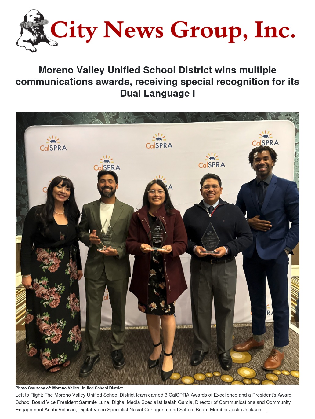 The California School Public Relations Association (CalSPRA), a nationally recognized leader in school communications, announced Moreno Valley Unified School District (MVUSD) as the recipient of the President’s Award and three Awards of Excellence at its annual conference on Friday, March 13, 2026.