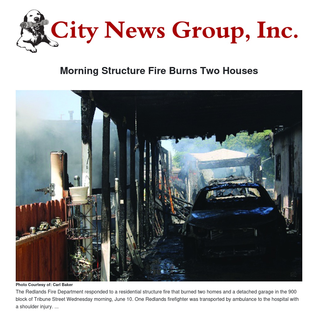 The Redlands Fire Department responded to a residential structure fire that burned two homes and a detached garage in the 900 block of Tribune Street Wednesday morning, June 10. One Redlands firefighter was transported by ambulance to the hospital with a shoulder injury.