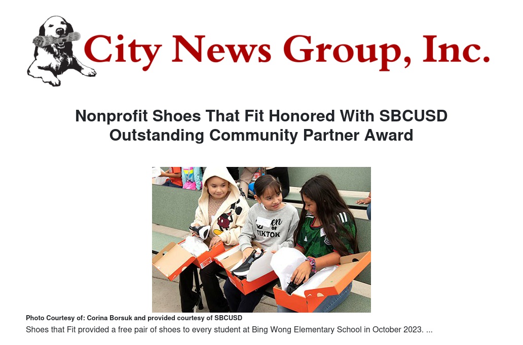 The San Bernardino City Unified School District (SBCUSD) is proud to announce that the Claremont-based nonprofit Shoes That Fit has been honored as the Outstanding Community Partner Award recipient for May.