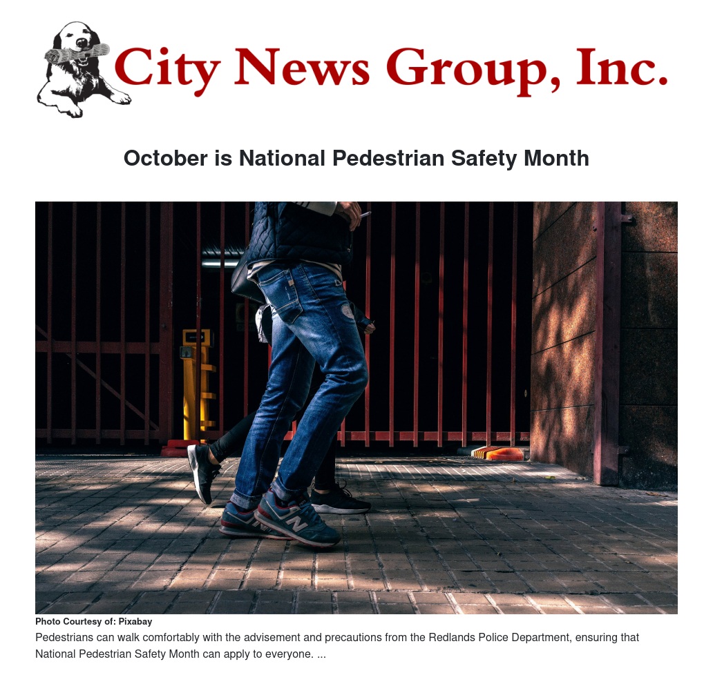 October is National Pedestrian Safety Month and the Redlands Police Department will raise awareness about the safety of people walking throughout the month, emphasizing that “safe drivers, safe speeds, and safe vehicles save lives.”
