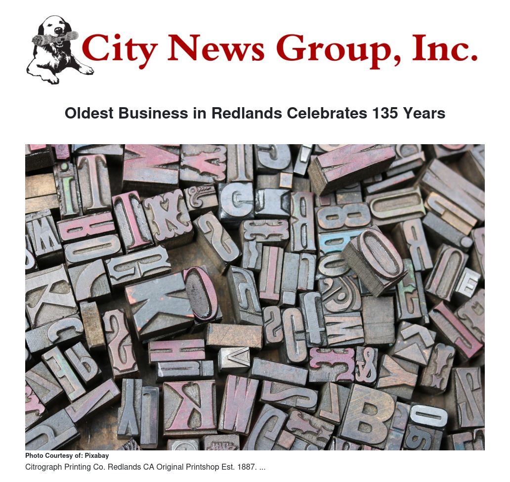 To glance back at its fascinating past and look forward to the limitless possibilities of the future, Citrograph Printing Co. will celebrate its landmark anniversary of 135 years with old and new friends, citizens and stewards of Redlands. The community is invited to stop by the shop at 113 E. State Street, the week of July 11 - 16 for anniversary specials, and to see a bit of history.