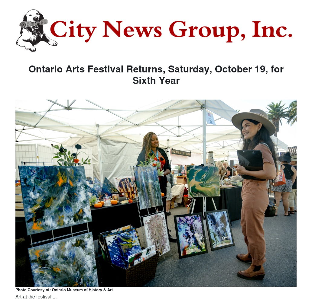“Each year the Ontario Arts Festival adds new things to intrigue and delight both returning and new visitors,” said Nancy DeDiemar, CCMA’s Community Liaison. “Besides collection-worthy art, light jazz music, tasty street food and locally brewed beer, 2024 Festival visitors can observe art being made by demonstrating artists and participate in art-related activities.”