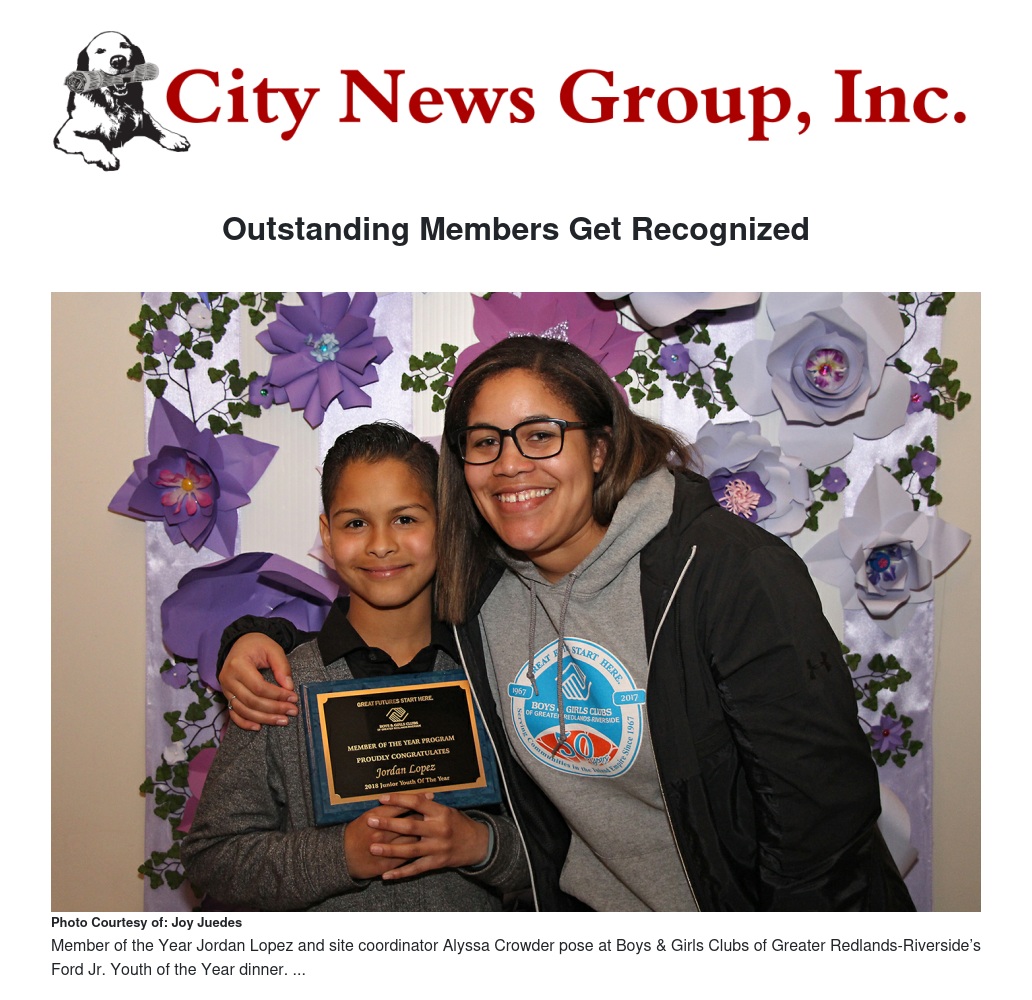 Boys & Girls Clubs of Greater Redlands-Riverside honored its outstanding members at a dinner at the Burrage Mansion on March 6. The Club recognized its Ford Junior Youth of the Year, Member of the Year, Members of the Month and Staff of the Year. Jesse Ambrosio was Ford Junior Youth of the Year, Jordan Lopez was Member of the Year, and Director of Program Services Eddie Hernandez was Staff of the Year.
