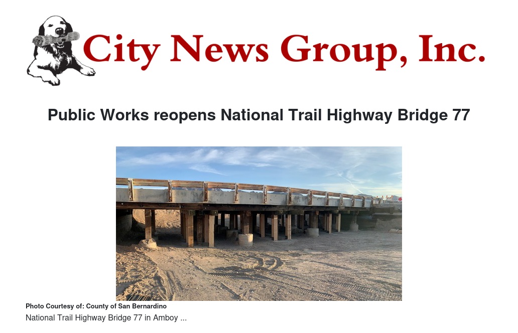 The Department of Public Works (DPW) is pleased to announce that it has reopened the National Trail Highway Bridge 77 in Amboy after receiving its final inspection by Caltrans District 8 on Thursday, March 21.
