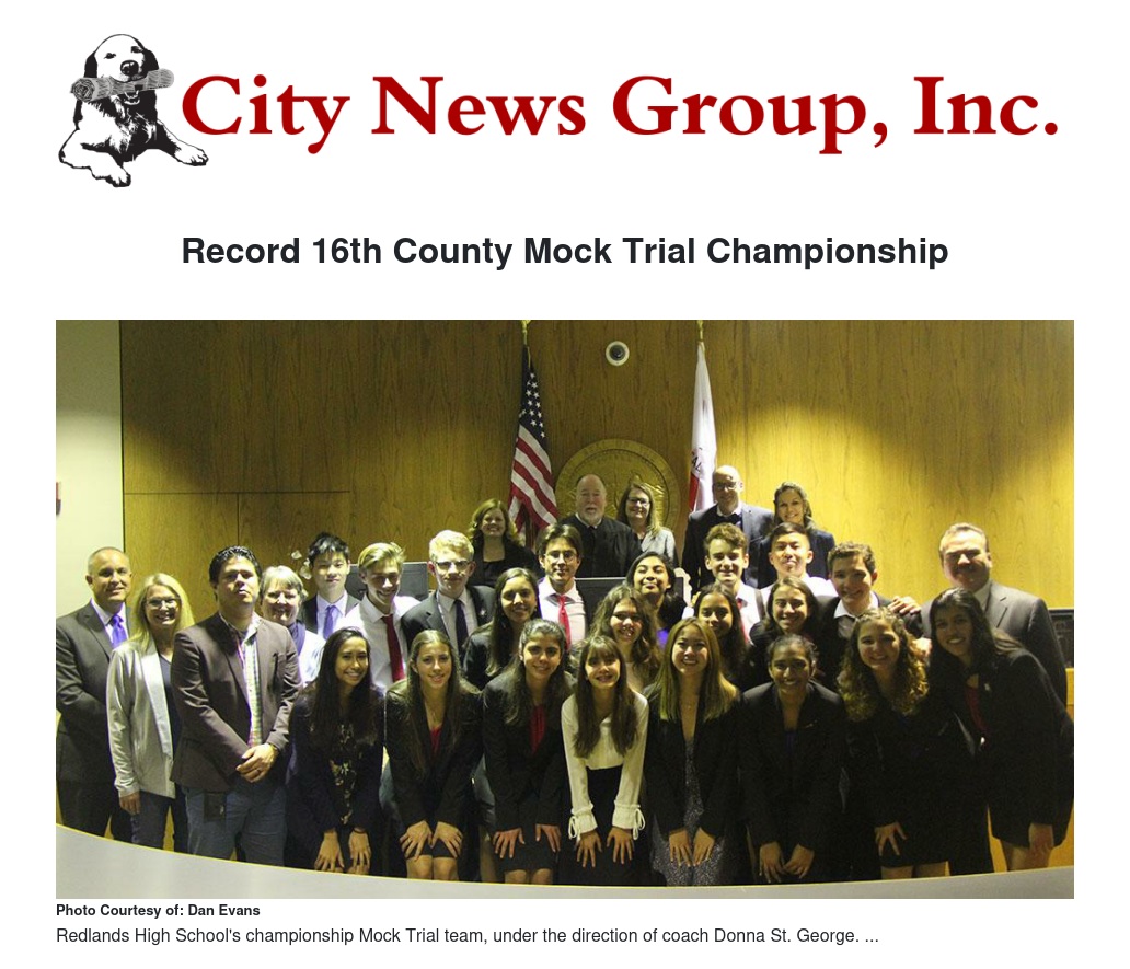 Redlands High School extended its record for San Bernardino County Mock Trial championships to 16 on Jan. 18 as it defeated Rancho Cucamonga in the 38th annual competition.