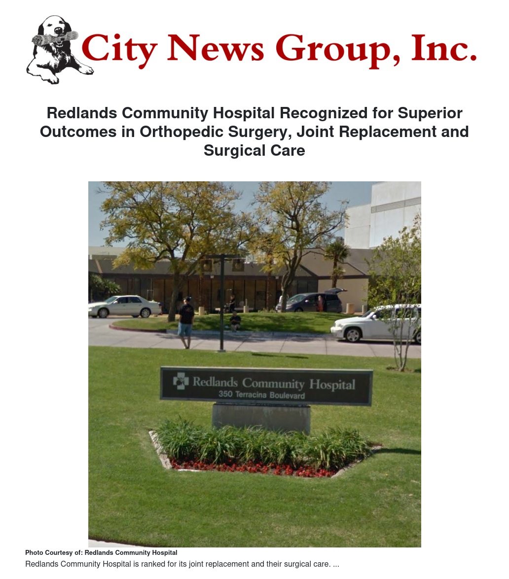 “We are proud to be named among California’s top 3 hospitals for joint replacement and surgical care and among the top 5 for orthopedic surgery,” said James Holmes, Redlands Community Hospital President and CEO. “This recognition demonstrates the expertise of our physicians, nurses, and staff and their commitment to providing exceptional health services to each patient who puts their trust in our care.”