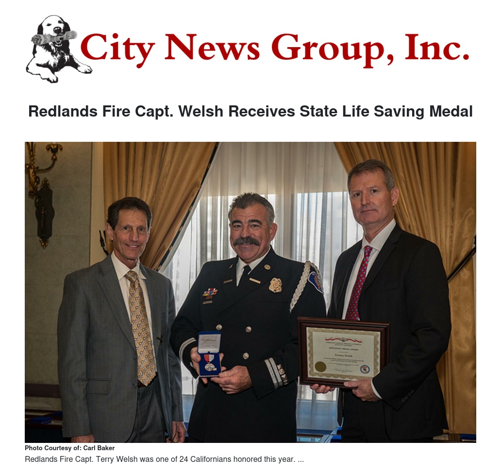 Redlands Fire Capt. Terry Welsh received the California Emergency Medical Services Authority’s Life Saving Medal, one of 24 Californians honored this year for their heroic acts and extraordinary contributions to emergency medical services.