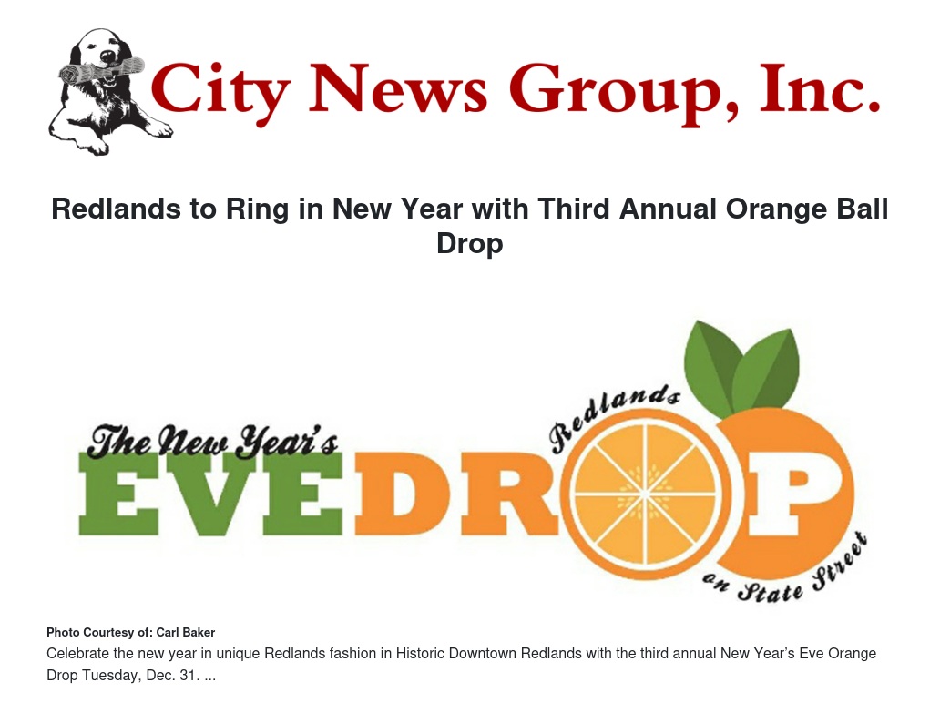 Redlands and the Redlands Chamber of Commerce, present the Third Annual Orange Ball Drop. The evening will include food and drink vendors including sweet potato chips, potato on a stick, kettle corn and funnel cake, mini donuts, gourmet cotton candy, pulled pork sandwiches, ice cream sundaes, banana splits, root beer floats, hot chocolate hot apple cider and more.