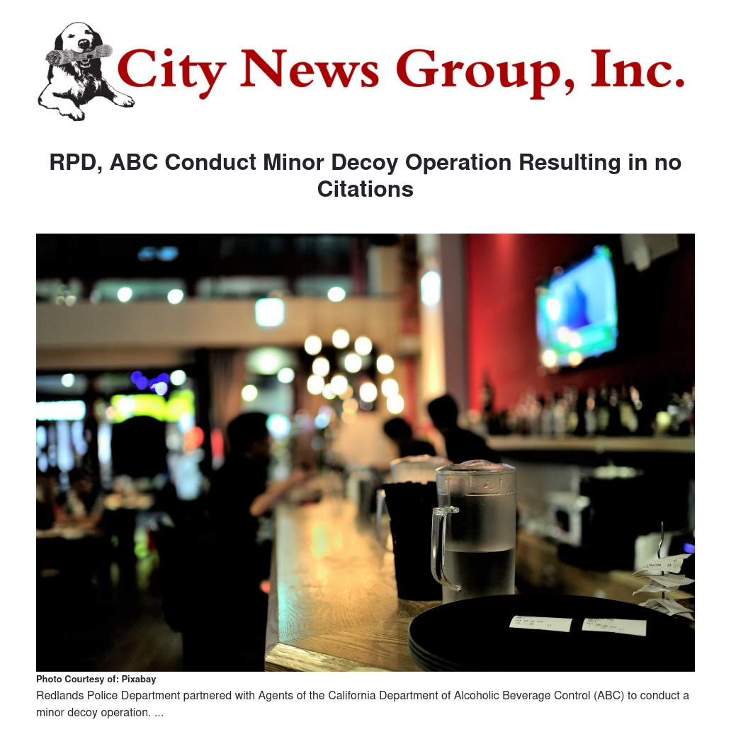 Agents of the California Department of Alcoholic Beverage Control (ABC) along with Redlands Police conducted a Minor Decoy operation, Saturday, Feb. 25, in which minors under the direct supervision of department agents, attempted to purchase alcohol from 14 retail licensees in the City of Redlands. None of the retailers sold alcohol to minors.