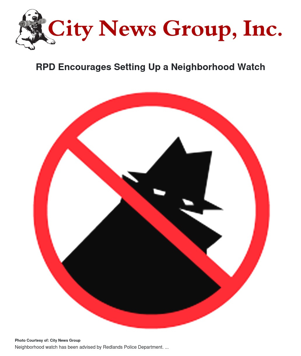 Anyone interested in starting a Neighborhood Watch Program may contact retired Redlands Police Cpl. Rick Strobaugh at rstrobaugh@redlandspolice.org. Strobaugh has been holding Neighborhood Watch meetings in Redlands since the early 1990s. Meetings are usually held at one of the neighborhood homes and run for about 90 minutes in the evening.
