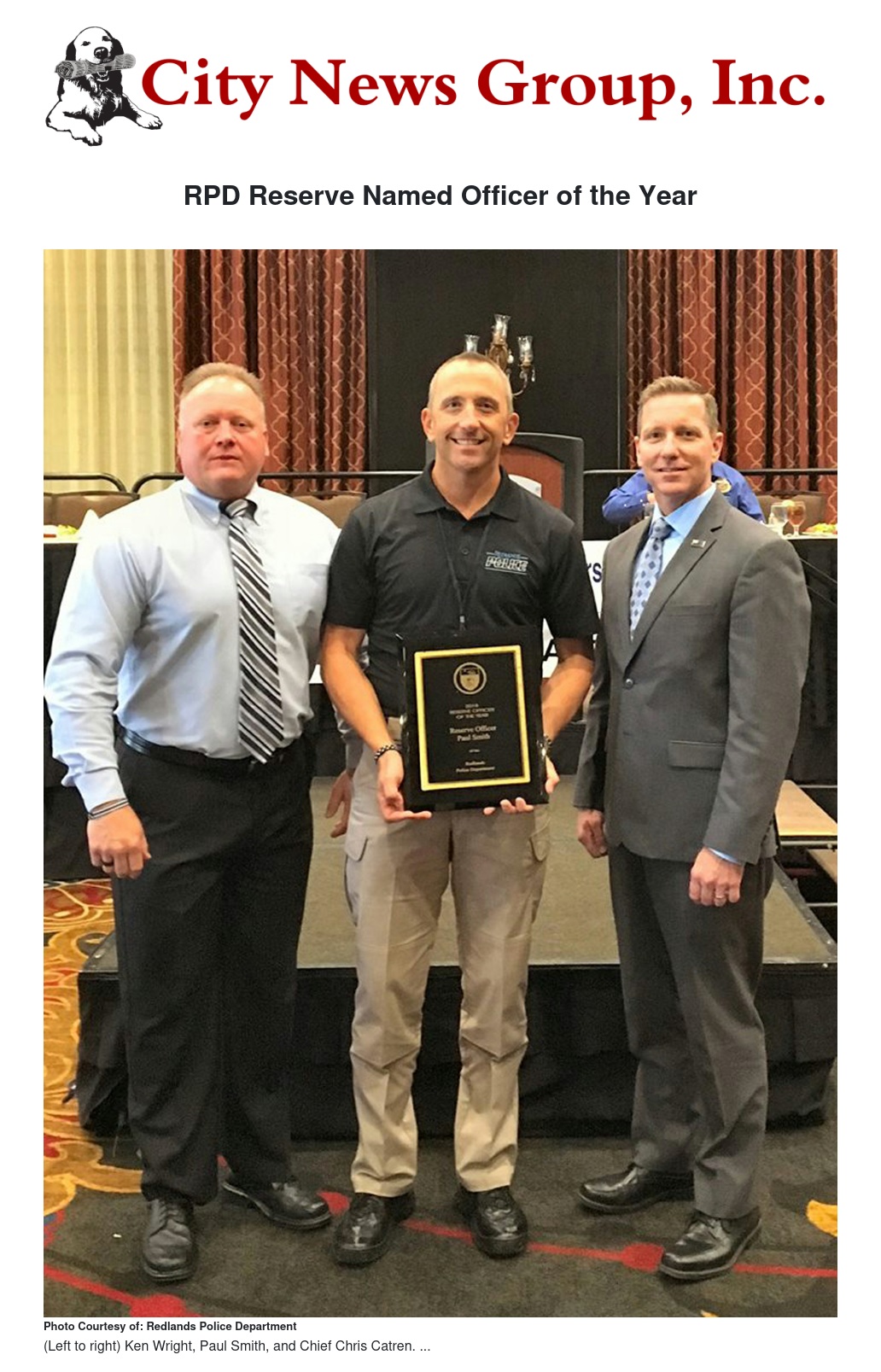 “Paul’s exceptional contributions of time and resources include working patrol, background investigations, special events, and nearly anything else asked of him,” said Redlands Chief of Police Chris Catren, who attended Friday’s award ceremony. “He also volunteers as a tactical officer with the Sheriff’s Department and helps train future peace officers. We have known for many years that Paul is an outstanding person, officer and friend and this award is further proof that he is truly an exceptional member of this Department.”