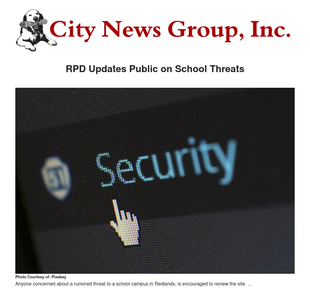 In an effort to provide the community with accurate information on reported school threats, the Redlands Police Department, working in cooperation with the Redlands Unified School District, will provide a central online information hub to keep parents, students and the community informed of the current investigation status of rumored threats to Redlands schools.