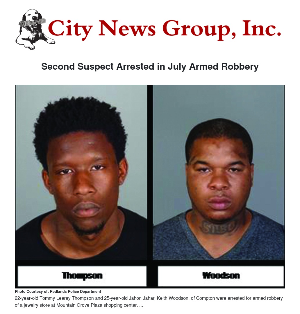Redlands Police investigators later identified the second suspect as 25-year-old Jahon Jahari Keith Woodson, of Compton. Police obtained a warrant for Woodson’s arrest and on Aug. 1, Los Angeles County Sheriff’s deputies located Woodson in Palmdale. Redlands Police responded and arrested Woodson on the robbery charge. The District Attorney’s Office has filed robbery charges on both Woodson and Thompson.
