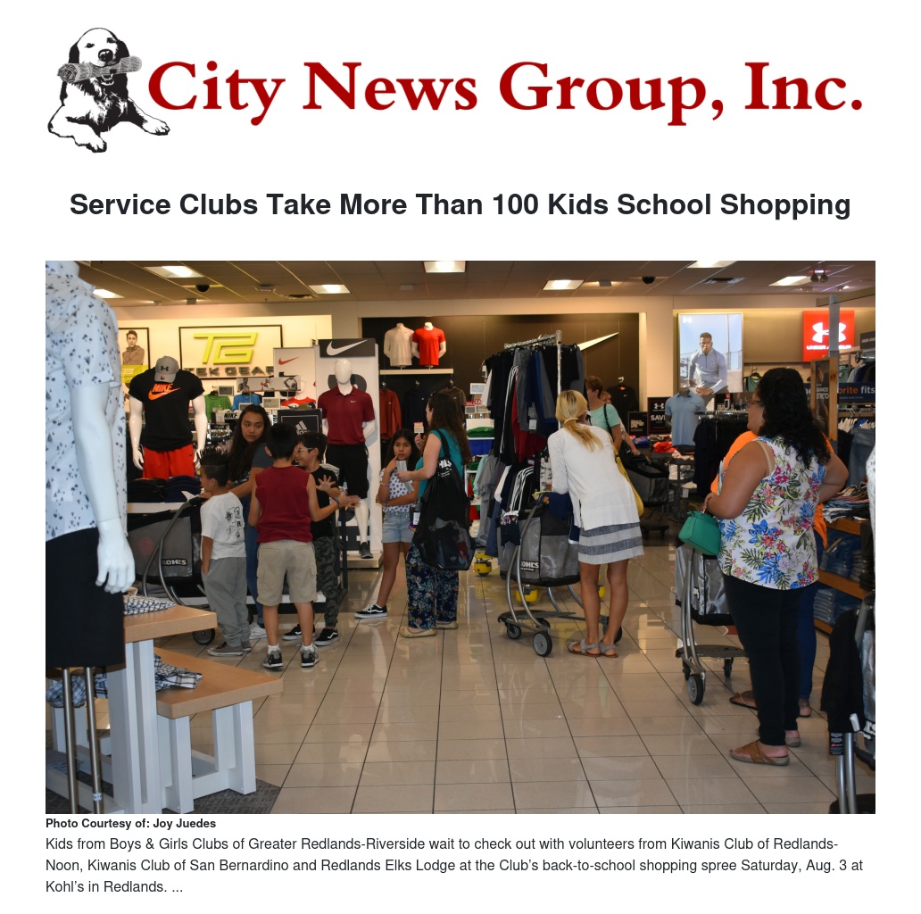 Three local service clubs took more than 100 youth from Boys & Girls Clubs of Greater Redlands-Riverside back-to-school shopping on Aug. 3. Kiwanis Club of Redlands-Noon, Kiwanis Club of San Bernardino and Redlands Elks Lodge paid for the youth to each get $100 worth of clothes, shoes, socks and other essentials at Kohl’s in Redlands. A service club volunteer was paired with each young person and accompanied them around the store.