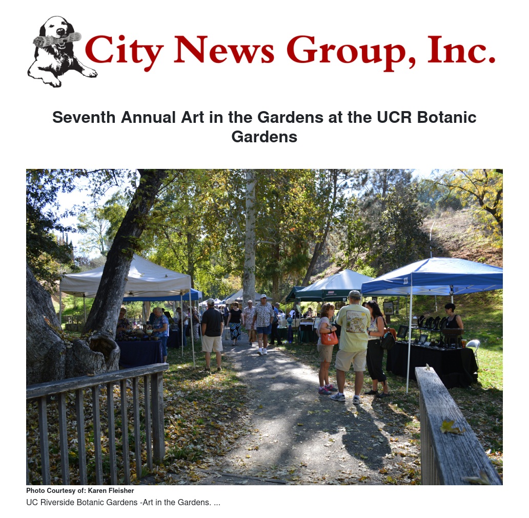 Twenty-five local artists will be selling a wide variety of art at the seventh annual Art in the Gardens on Saturday, November 3, from 10 a.m. to 3 p.m. at the UC Riverside Botanic Gardens. This free event is a fundraiser for the Botanic Gardens and helps raise funds for the outreach and education programs provided to the community, including to thousands of school children annually.
