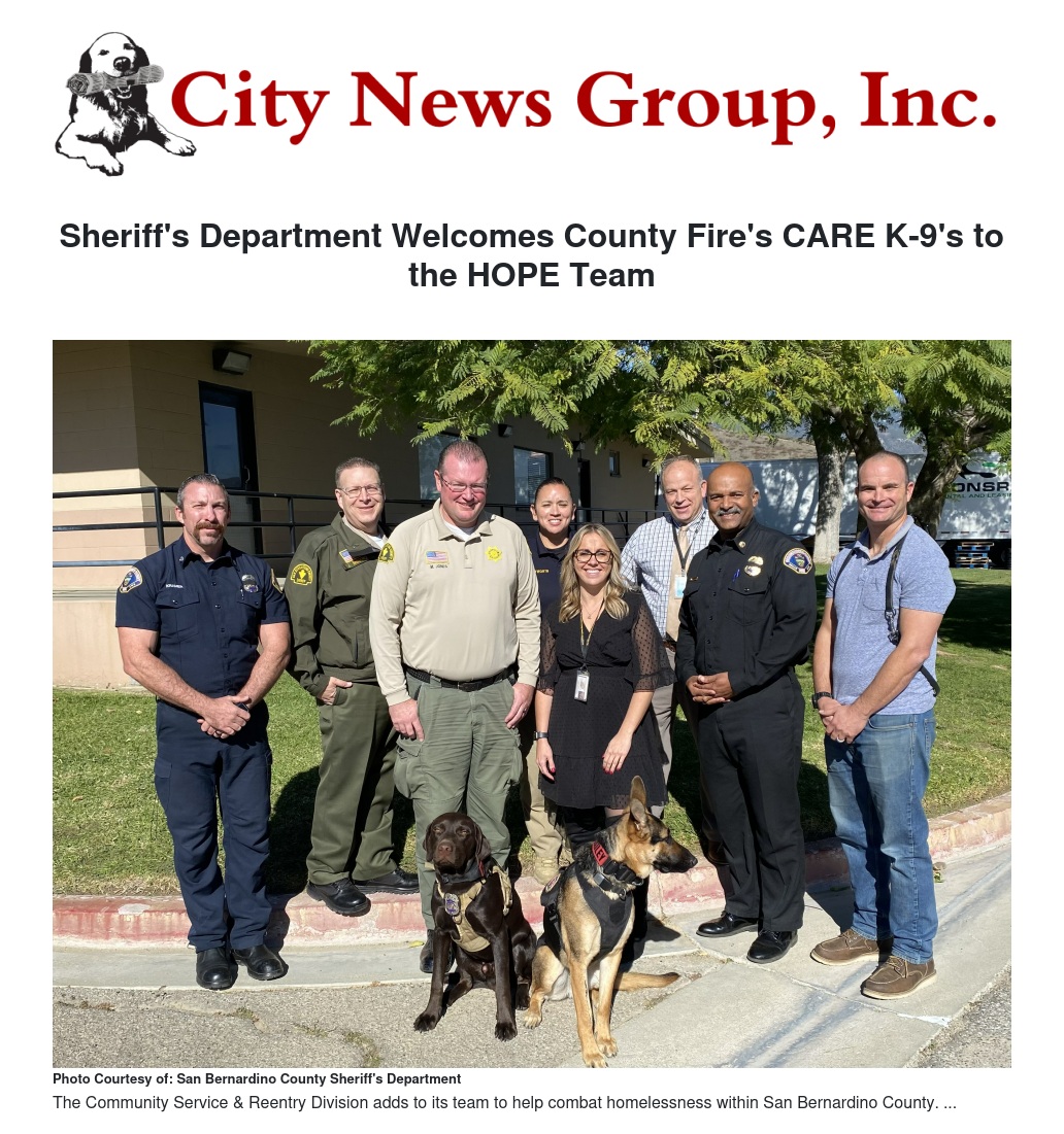 The Community Service & Reentry Division welcomes San Bernardino County Fire District Captain Paul Kramer and Engineer/Paramedic Steven Story, and their CARE K9 partners Bailey and Cooper, to our HOPE Team.