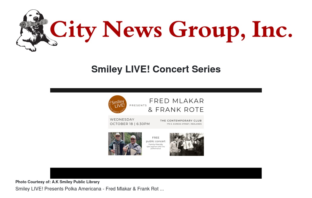 Bruce Triggs, 2019. Accordion Revolution: A People’s History of the Accordion in North America from the Industrial Revolution to Rock ’n’ Roll.Smiley LIVE! is a series of monthly free concerts featuring a variety of musical genres sponsored by the A.K. Smiley Public Library.