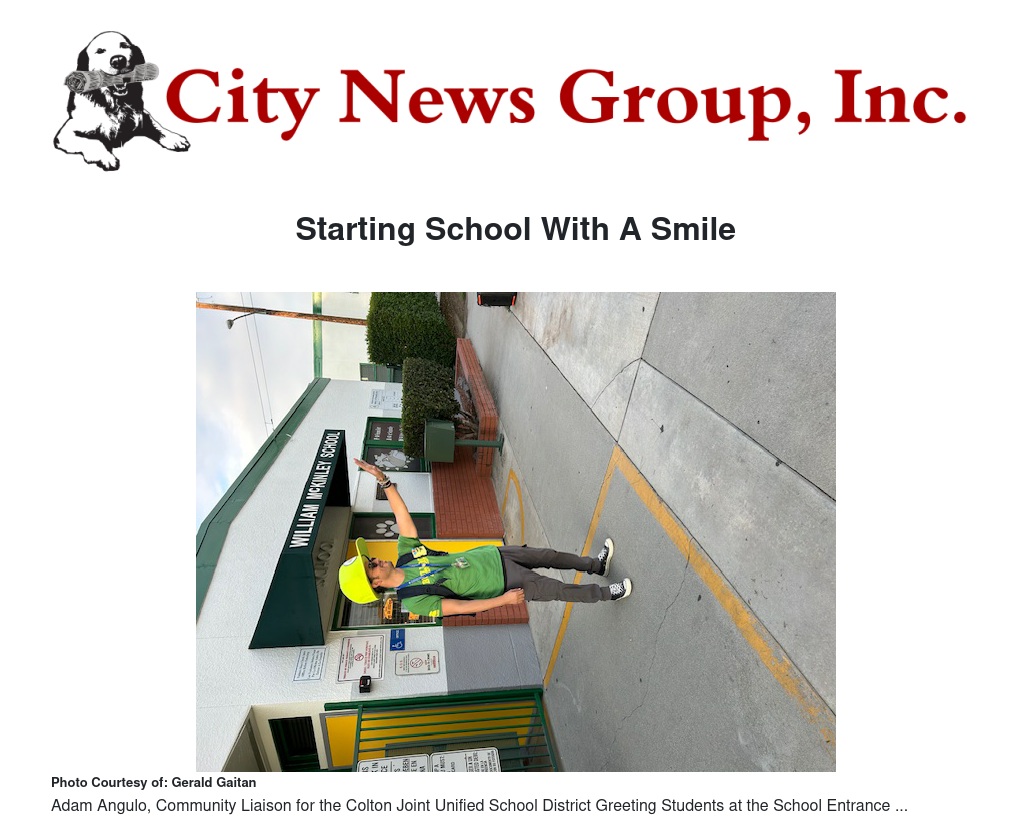 Every morning at McKinley Elementary School, students are greeted with a high five, fist bump, and a smile from Adam Angulo, Community Liaison for the Colton Joint Unified School District.