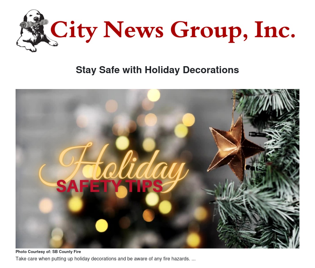 With the holiday season upon us, the San Bernardino County Fire Department reminds residents of the following holiday decorating and natural Christmas tree safety tips.