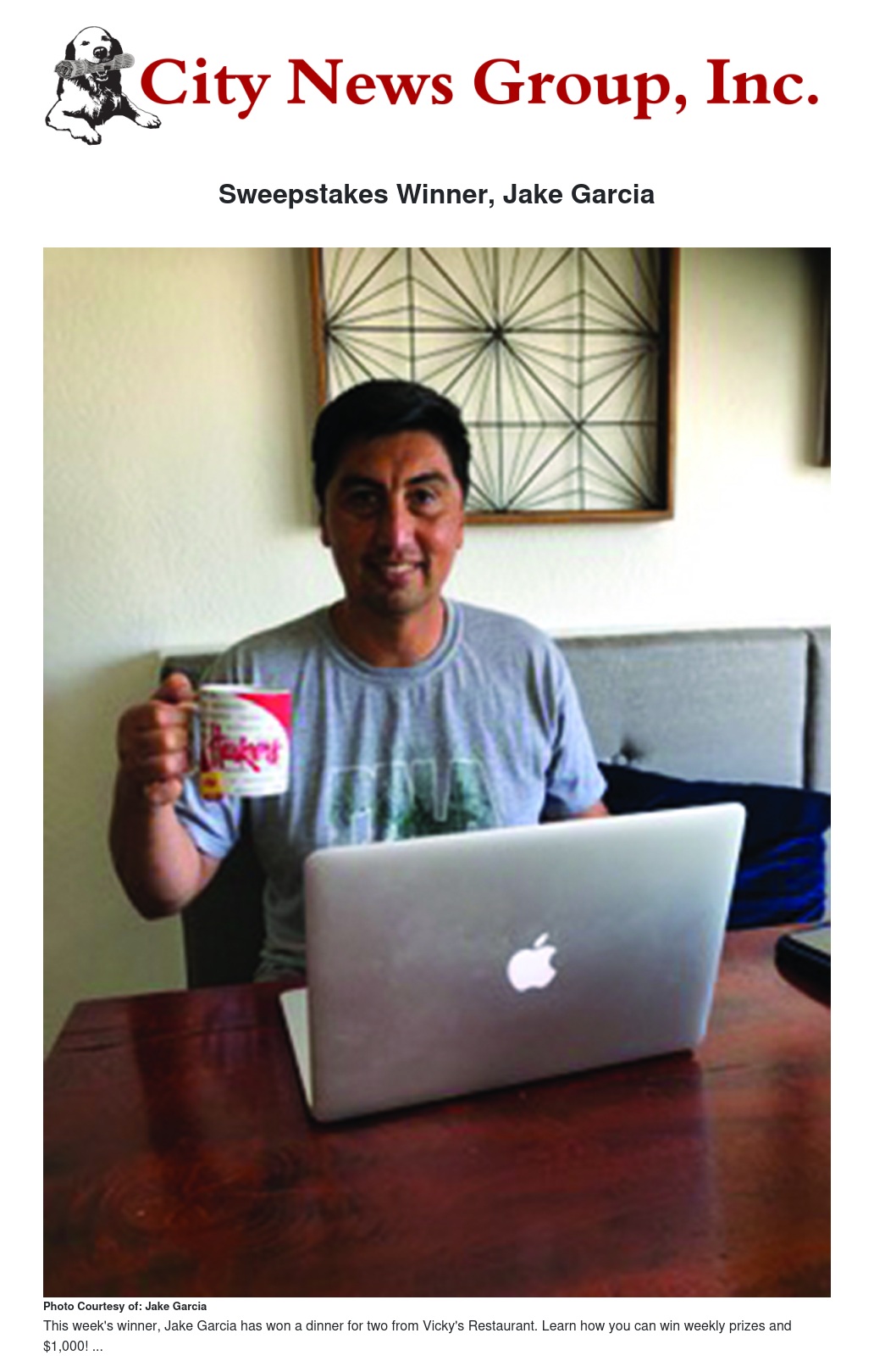 Jake Garcia is this week’s winner of the City News Group, Inc. $1,000 sweepstakes opportunity drawing! As this week’s winner of the weekly prize giveaway, Garcia has won a dinner for two from Vicky’s Restaurant.