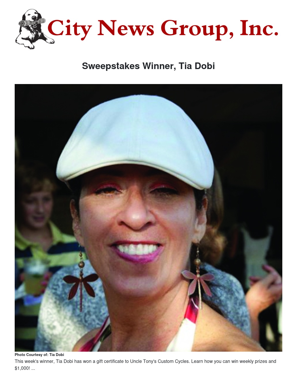Tia Dobi is this week’s winner of the City News Group, Inc. $1,000 sweepstakes opportunity drawing! As this week’s winner of the weekly prize giveaway, Dobi has won a $30 gift certificate to Uncle Tony’s Custom Cycles.