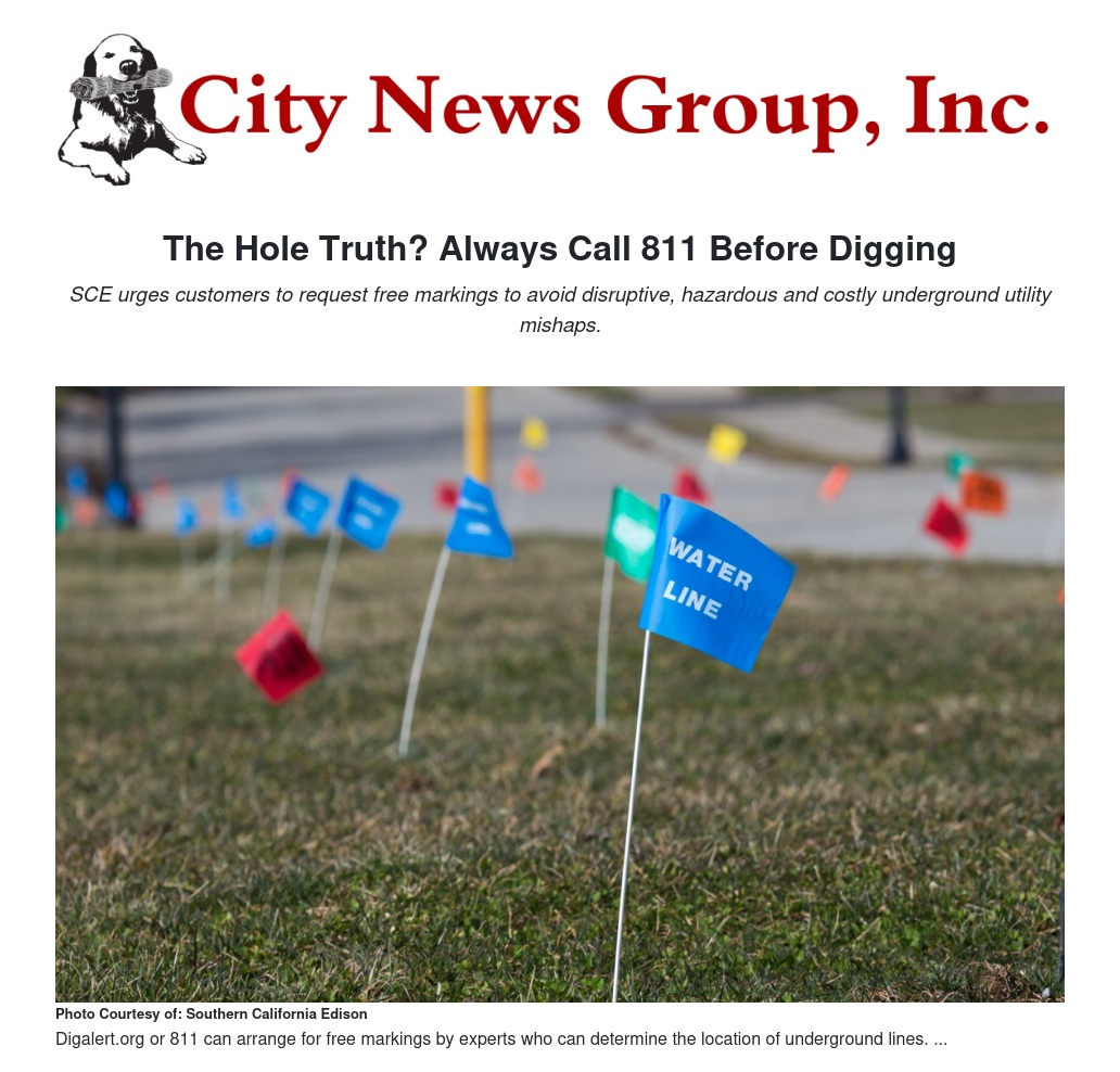 With April’s National Safe Digging Month upon us, Southern California Edison reminds homeowners and contractors that the only way to safely begin any digging project around the country’s more than 200 million miles of underground utilities is to call 811 or schedule an appointment online at least two working days before. Digalert.org or 811 can arrange to have underground utility lines identified and marked by experts for free.