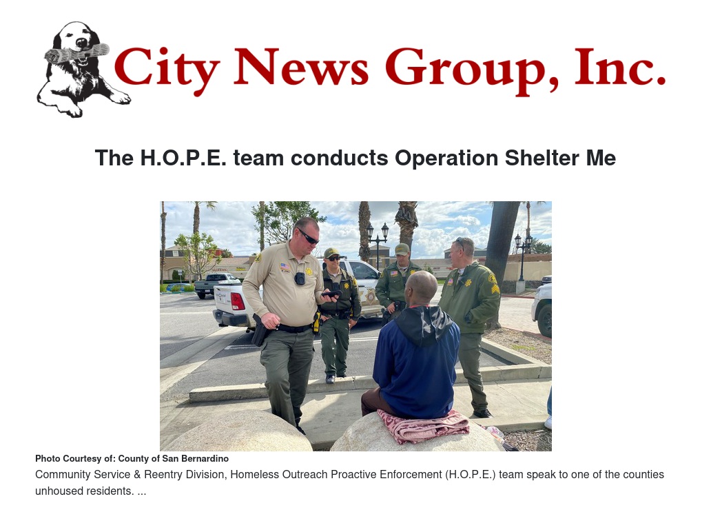Recently, the Community Service & Reentry Division, Homeless Outreach Proactive Enforcement (H.O.P.E.) team conducted “Operation Shelter Me” in San Bernardino County. Operation Shelter Me aims to connect staff with unhoused residents and offer them housing, medical and mental health treatment services. During this operation, the team focused on those with the most significant mental illness to get those individuals linked to restorative mental health pathways.