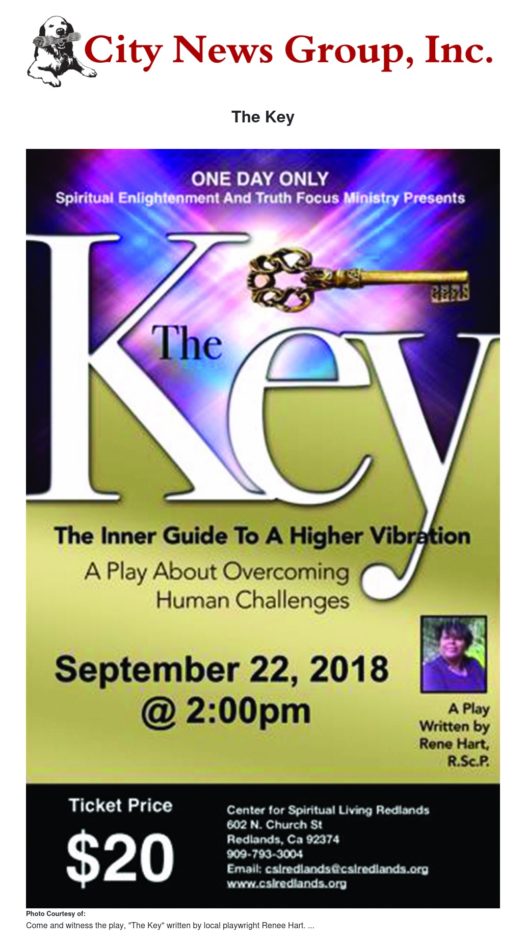 On Saturday, September 22, 2018 at 2:00pm the Center for Spiritual Living Redlands located at 602 Church St, Redlands, CA is presenting a play written by local playwright Renee Hart RScP entitled: THE KEY, The Inner Guide to a Higher Vibration.