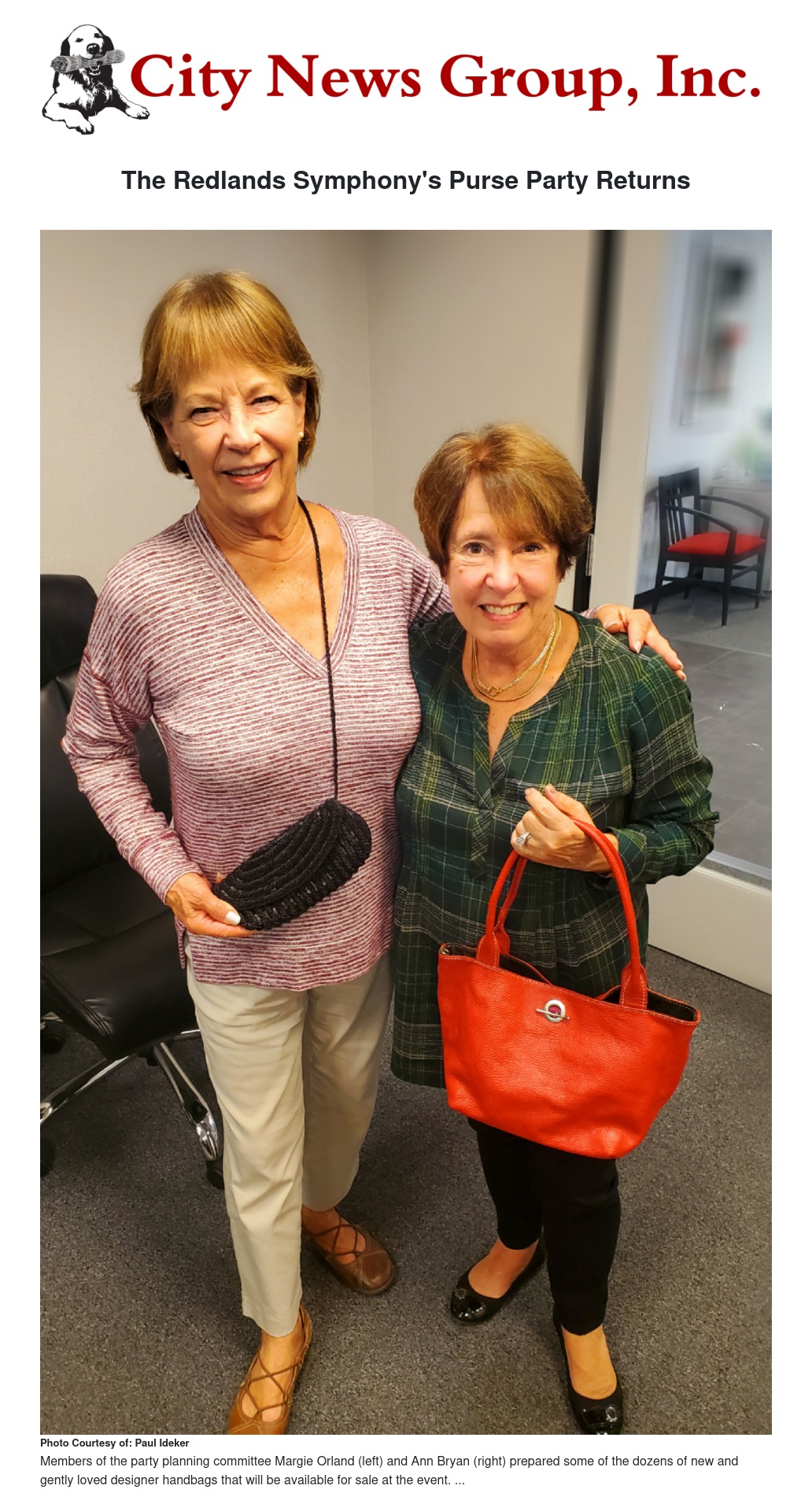 Anyone with a gently loved designer bag they would like to donate to the Party should bring it to the Symphony office from 9-5, Monday through Friday. The office is located at 112 E. Olive Ave., Suite C in Redlands.