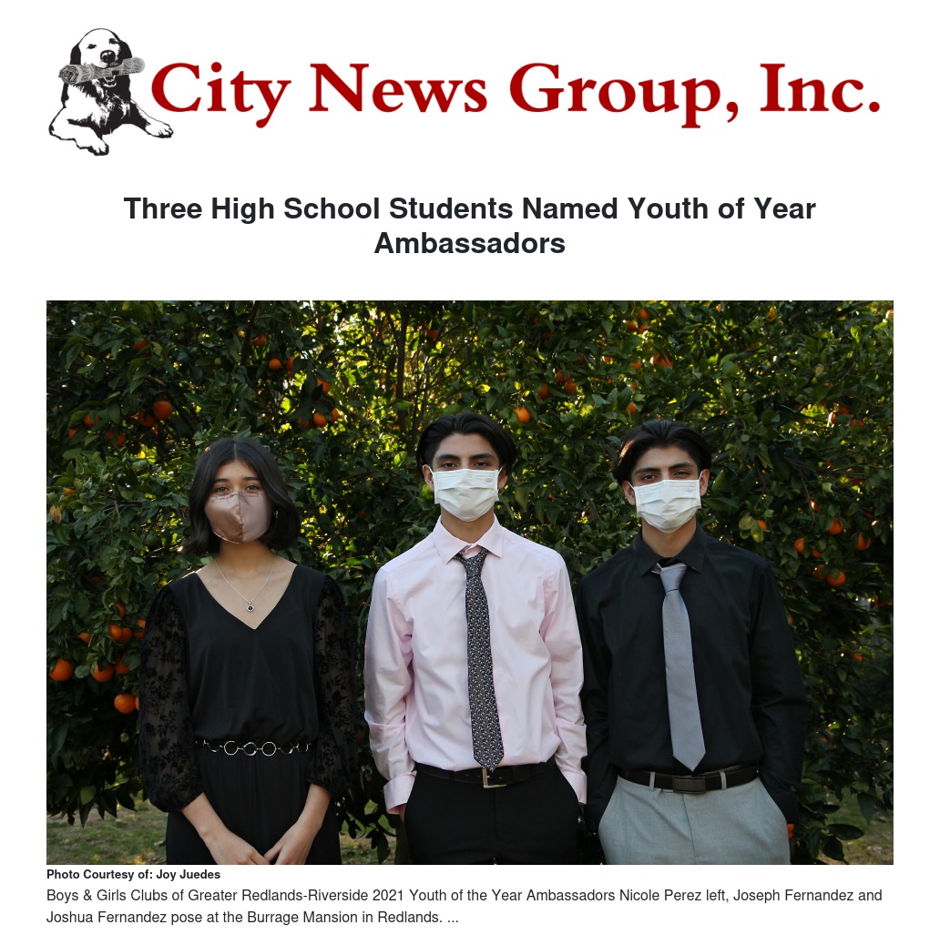 Three local high school students have been named 2021 Youth of the Year Ambassadors for Boys & Girls Clubs of Greater Redlands-Riverside.