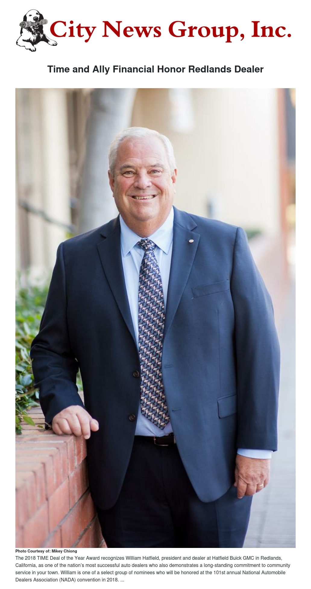The nomination of William Hatfield, president and dealer at Hatfield Buick GMC in Redlands, California, for the 2018 TIME Dealer of the Year award was announced today by TIME.